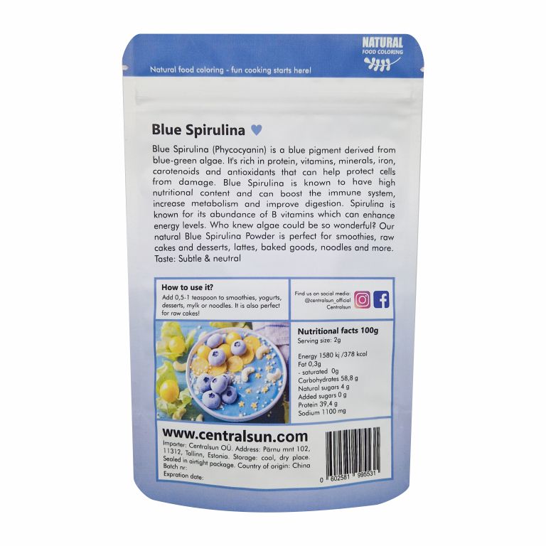 - Blå Spirulina er naturlig, glutenfri og fri for GMO.
