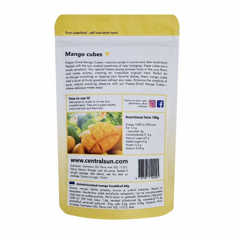 Unsere gefriergetrockneten Mangowürfel bieten nicht nur intensiven, natürlichen Geschmack, sondern sind auch ein wahres Kraftpaket an wertvollen Nährstoffen. Hergestellt aus vollreifen, frischen Bio-Mangos und schonend gefriergetrocknet, behalten sie ihre natürliche Süße, Farbe und Nährstoffdichte – ganz ohne Zuckerzusatz oder Konservierungsstoffe. Gefriergetrocknete Mangowürfel als gesunder Snack für jeden Tag sind die perfekte Ergänzung für eine ausgewogene Ernährung.