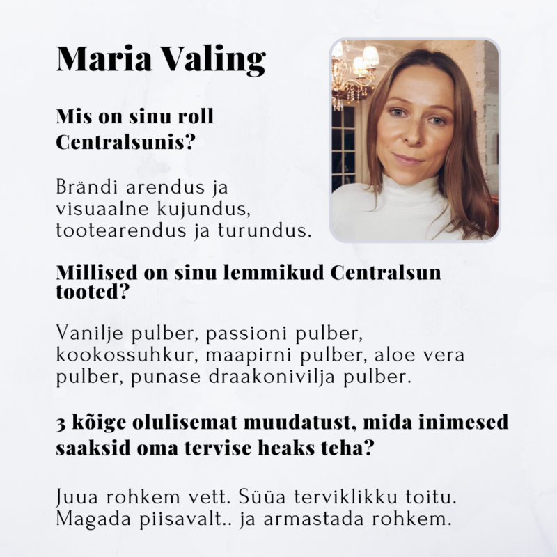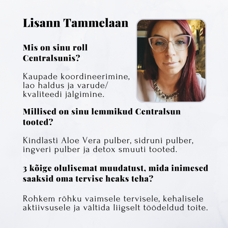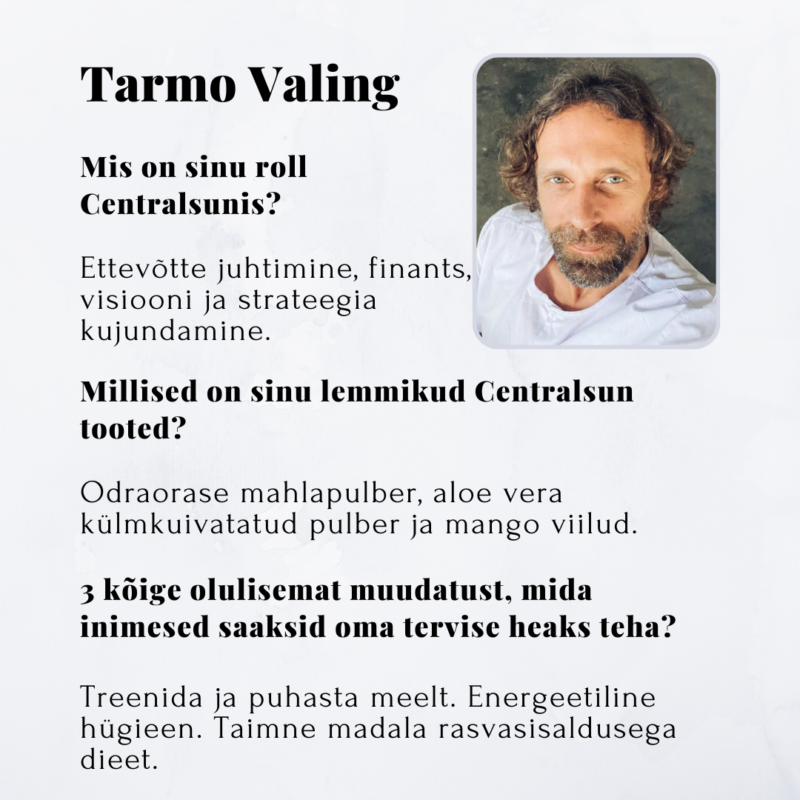 Centralsun wurde 2020 in Estland ins Leben gerufen, als Tarmo und Maria – ein Ehepaar mit einer Leidenschaft für Gesundheit – ihre eigene Marke gründeten. Sie wollten Produkte anbieten, die sie selbst mit Überzeugung nutzen und lieben. Nach vielen Jahren auf ihrem Weg zu einem gesünderen Lebensstil wollten sie auch andere inspirieren, bewusstere Entscheidungen zu treffen. So begann alles mit einem einzigen Produkt – gefriergetrocknetem Drachenfruchtpulver. Schon bald kamen weitere spannende und hochwertige Produkte hinzu, die die Herzen der Menschen in Estland im Sturm eroberten. Heute hat Centralsun Kunden auf der ganzen Welt, und das Interesse an gesunder Ernährung wächst stetig. Im Jahr 2021 trat auch Tarmos Tochter Lisann dem Unternehmen bei.