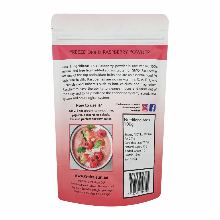Centralsuni külmkuivatatud mahe vaarika pulber on 100% puhas ning vegan. Vaarika pulber on vaba lisatud suhkrutest, gluteenist ning GMO-st. Pakis on vaid puhas ning looduslikku päritolu vaarika pulber ilma ühegi lisaaineta!