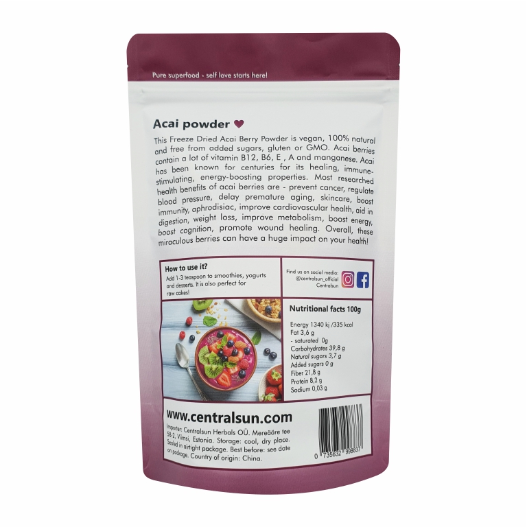 Centralsuni acai pulber on mahe 100% puhas, vegan. Vaba lisatud suhkrutest, gluteenist, GMOst.