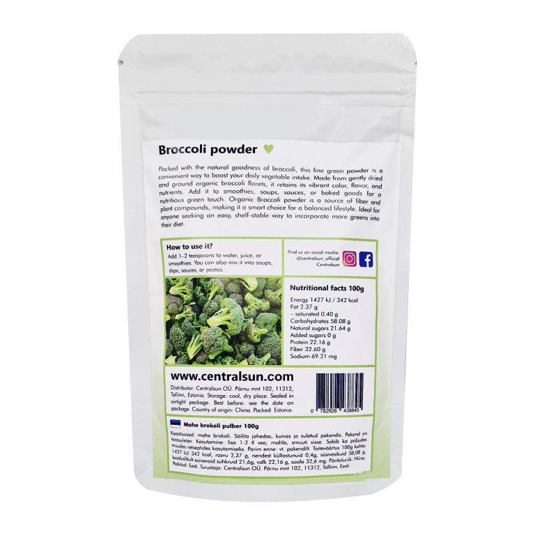 Centralsuni brokoli pulber on valmistatud 100% sertifitseeritud mahepõllumajandusest pärit brokolist, mille kuivatamine ja jahvatamine toimub madalal temperatuuril, et säiliks võimalikult palju väärtuslikke toitaineid. See tähendab, et saad iga portsjoniga kätte mitte ainult brokoli loomuliku maitse, vaid ka selle olulised vitamiinid, mineraalid ja fütotoitained.