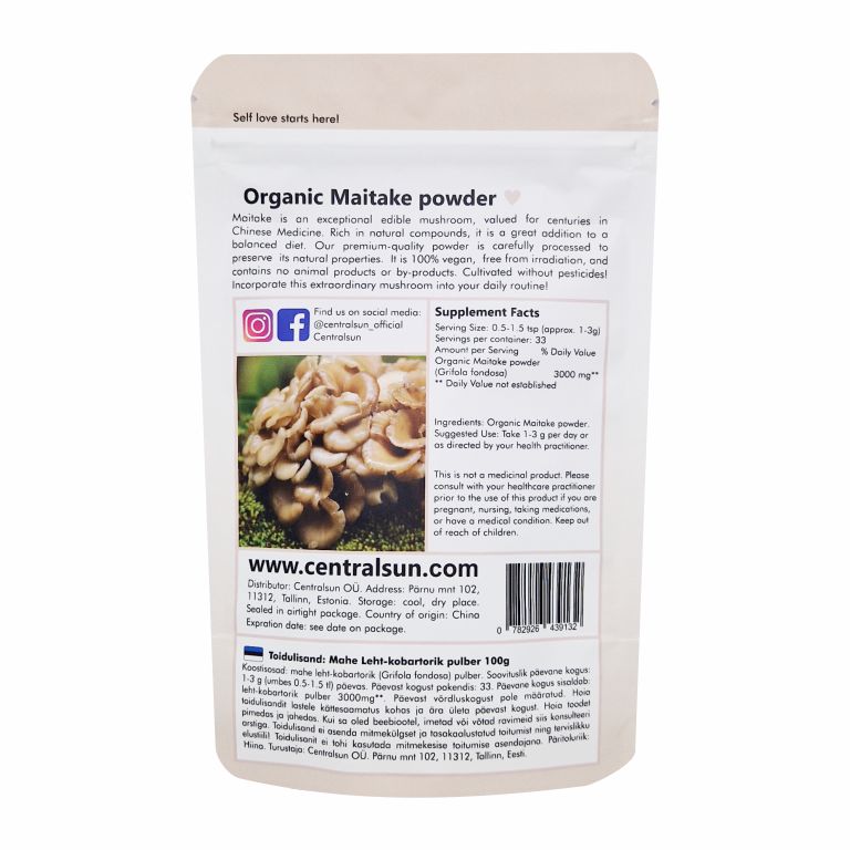 Centralsun mahe maitake seene pulber on valmistatud 100% puhtast maitake seenest, ilma kunstlike lisanditeta. Tegu on sertifitseeritud mahetootega, mille töötlemisel kasutatakse hoolikat madalal temperatuuril kuivatamist ja peenestamist. Nii säilivad seene looduslikud toimeained, mis toetavad organismi loomulikul viisil.
