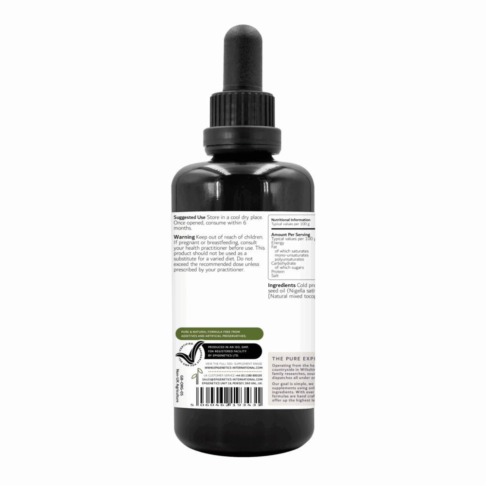 Epigeneticsi mahe mustköömne õli on pakendatud violetset tooni Mironi klaasist tinktuuripudelitesse, mis kaitsevad õli valguse kahjustava mõju eest, säilitades selle bioaktiivsed omadused. Toodetud Ühendkuningriigis vastavalt GMP ISO 9001:2015 standarditele ja sertifitseeritud mahetoode. Samuti on FDA nõuetekohaselt registreeritud ja GMO‑vaba, säilitusainete‑, gluteeni‑, laktoosi‑, soja‑ ja allergiavaba, sobilik veganitele ja alkoholivaba.