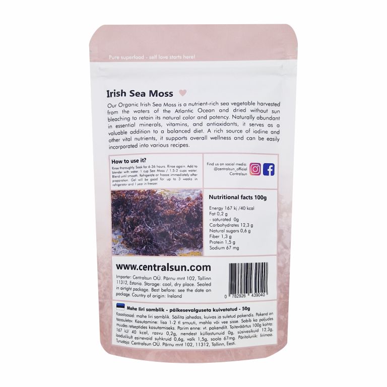 Luomu irlantilainen merisammal, tunnettu myös nimellä Irish Sea Moss tai tieteellisesti Chondrus crispus, on vuosisatojen ajan ollut arvostettu luonnollinen superfood, jota on perinteisesti käytetty Irlannissa ja Atlantin rannikkoyhteisöissä. Tämä luonnonvarainen punalevä kasvaa Atlantin valtameren viileissä ja mineraalipitoisissa vesissä kivikkoisilla rannoilla. Tuotteemme kerätään käsin Irlannin puhtailta rannikoilta.