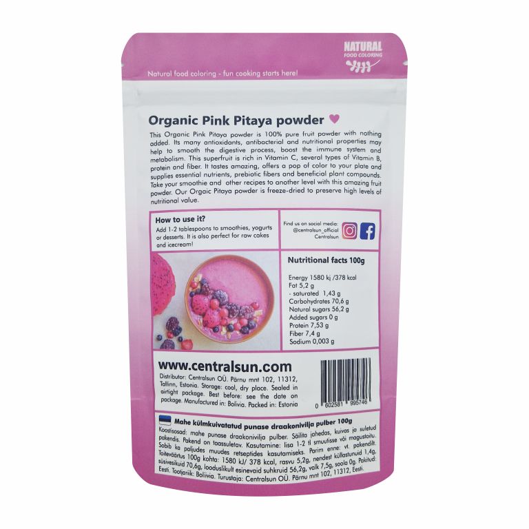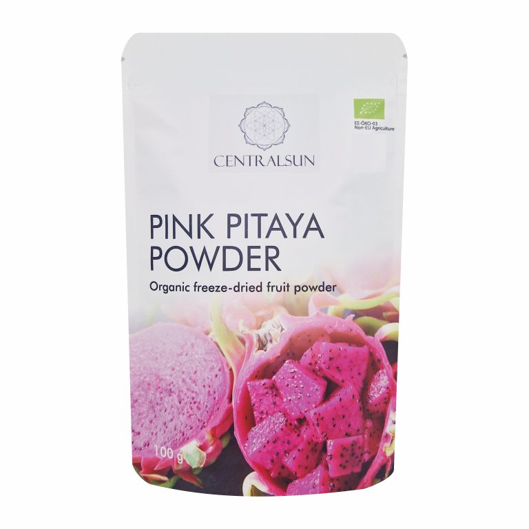 Centralsunin luomu pakastekuivattu punaisen lohikäärmehedelmän jauhe valmistetaan huolella valituista kypsistä hedelmistä. Valmistuksessa käytetään pakastekuivausmenetelmää, jossa hedelmästä poistetaan vesi, mutta kaikki ravintoaineet ja luonnollinen maku säilyvät. Tuloksena on kevyt ja pitkäikäinen jauhe, joka sopii täydellisesti erilaisten ruokien rikastamiseen.