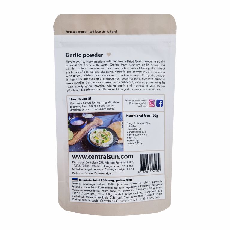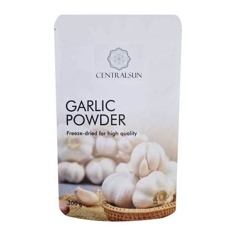 Säilytä pakkaus huoneenlämmössä, suojattuna suoralta auringonvalolta. Sulje pakkaus huolellisesti käytön jälkeen. Centralsunin pakastekuivattu valkosipulijauhe on 100% lisäaineeton ja sopii vegaaneille.