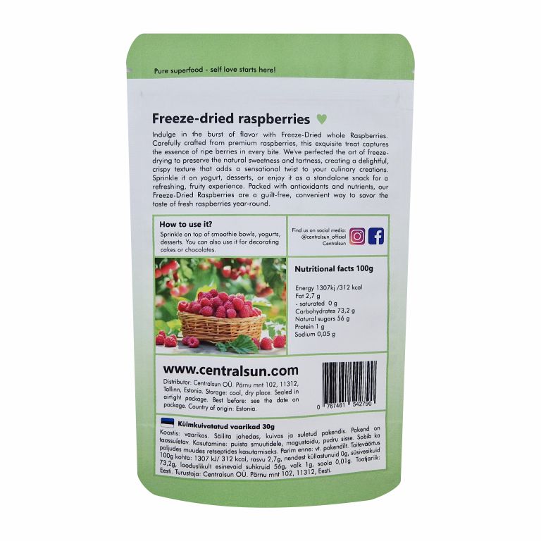 Pakastekuivatut vadelmat, joita tarjoamme, ovat ihanteellinen yhdistelmä runsaita ravinteita ja intensiivistä makua, joka ilahduttaa makuaistejasi joka askeleella. Vadelmat kerätään kypsinä, mikä takaa niiden täydellisen maun ja laadun. Sen jälkeen ne käyvät läpi perusteellisen pakastekuivausprosessin, joka varmistaa pitkän säilyvyyden, jotta voit nauttia niistä ympäri vuoden.