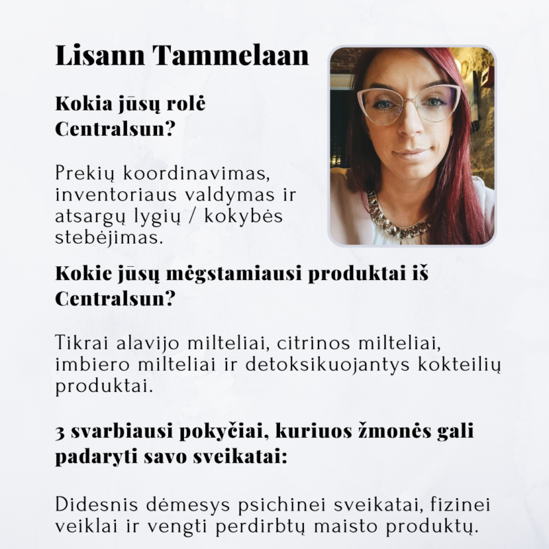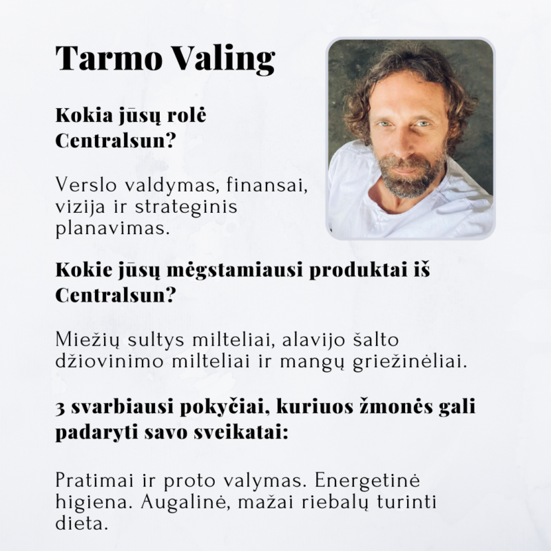 Centralsun buvo įkurtas Estijoje 2020 m., kai sutuoktiniai Tarmo ir Maria nusprendė sukurti savo prekės ženklą, siūlantį sveikatos produktus, kuriuos jie patys naudoja ir mėgsta. Po daugelio metų sveiko gyvenimo kelionės jie norėjo įkvėpti kitus priimti sąmoningesnius pasirinkimus. Viskas prasidėjo nuo vieno produkto – užšaldytų drakono vaisių miltelių. Netrukus produktų asortimentą papildė kiti įdomūs ir aukštos kokybės produktai, greitai užkariavę žmonių širdis Estijoje. Šiandien Centralsun turi klientų visame pasaulyje, o susidomėjimas sveikais produktais ir toliau auga. 2021 m. į įmonę prisijungė ir Tarmo dukra Lisann.