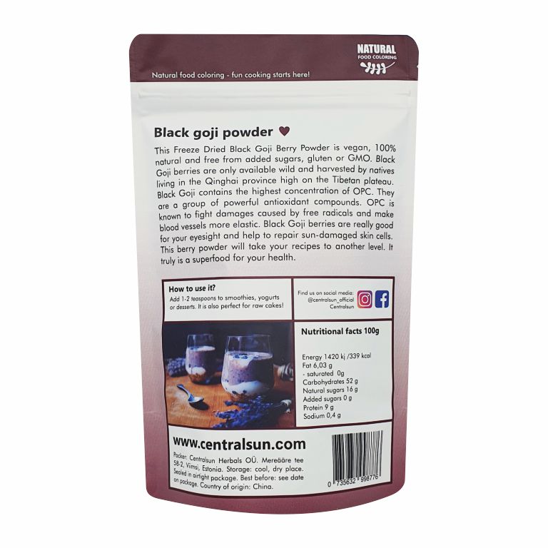 Black goji berry powder is a special and rare freeze-dried powder with no additives. Simply dried and ground powerful berries. A great addition to smoothies, banana ice cream, raw jam, porridge and many other recipes. One of the most nutritious superfoods you can add to your recipes.