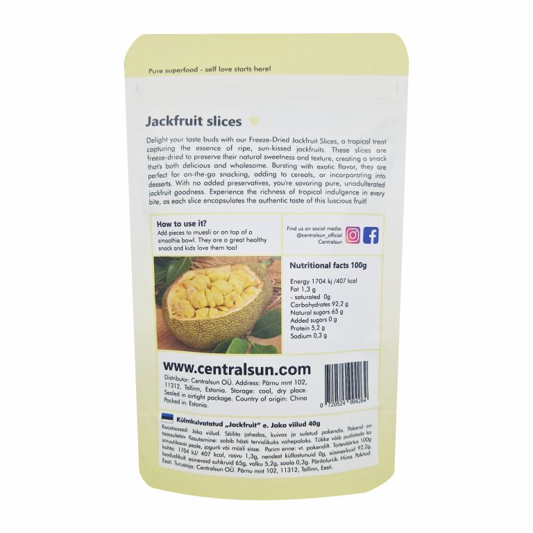 Centralsun Freeze-dried Jackfruit Slices are 100% pure and vegan. Free of additives, gluten, GMOs.