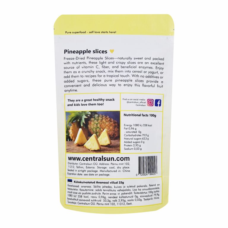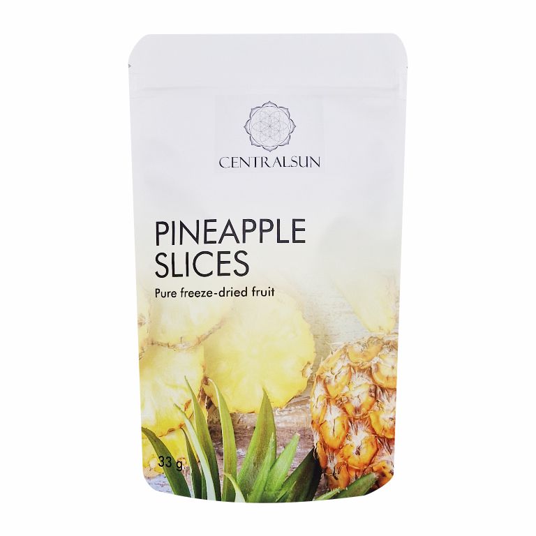 Centralsun Freeze-dried Pineapple Slices are 100% pure and vegan. Free of additives, gluten, GMOs.