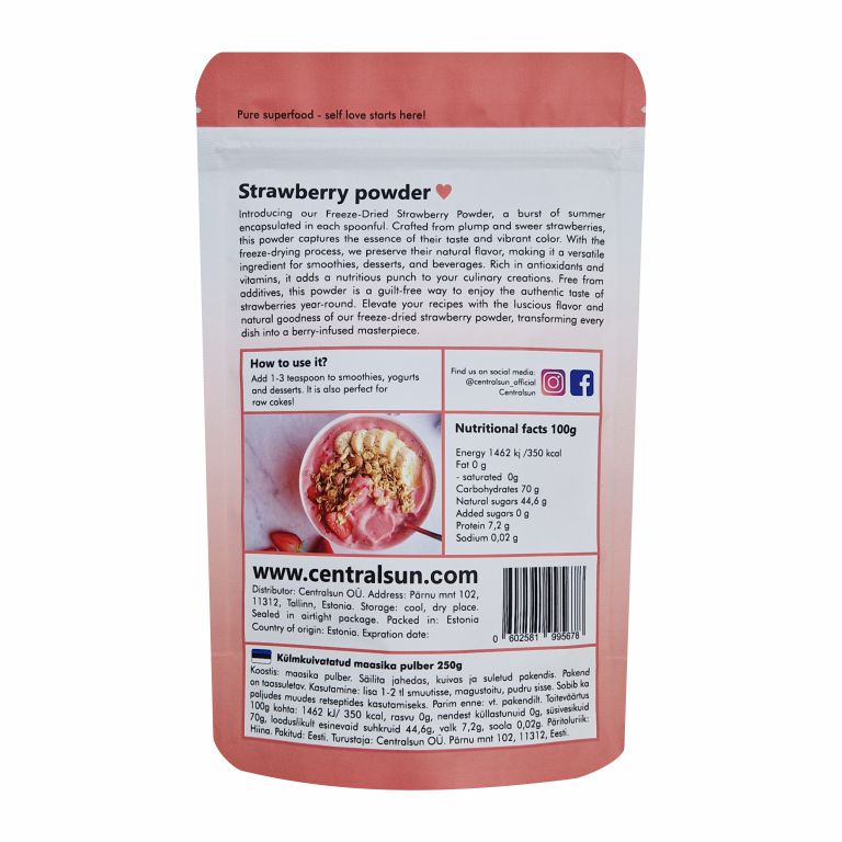 Store the package at room temperature, protected from direct sunlight. Close the package properly after use. Centralsun freeze-dried strawberry powder is 100% free of additives and suitable for vegans.