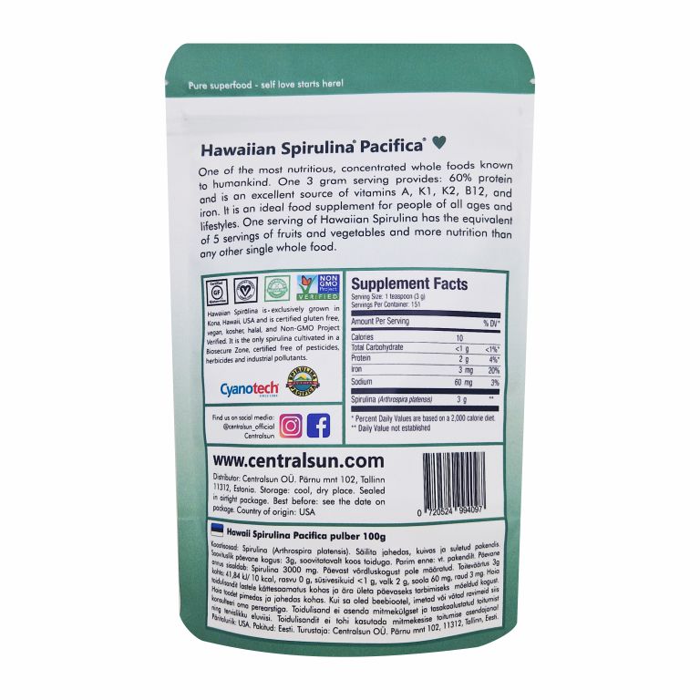 Centralsun Hawaiian Spirulina is 100% pure and vegan. Free of additives, gluten, GMOs.