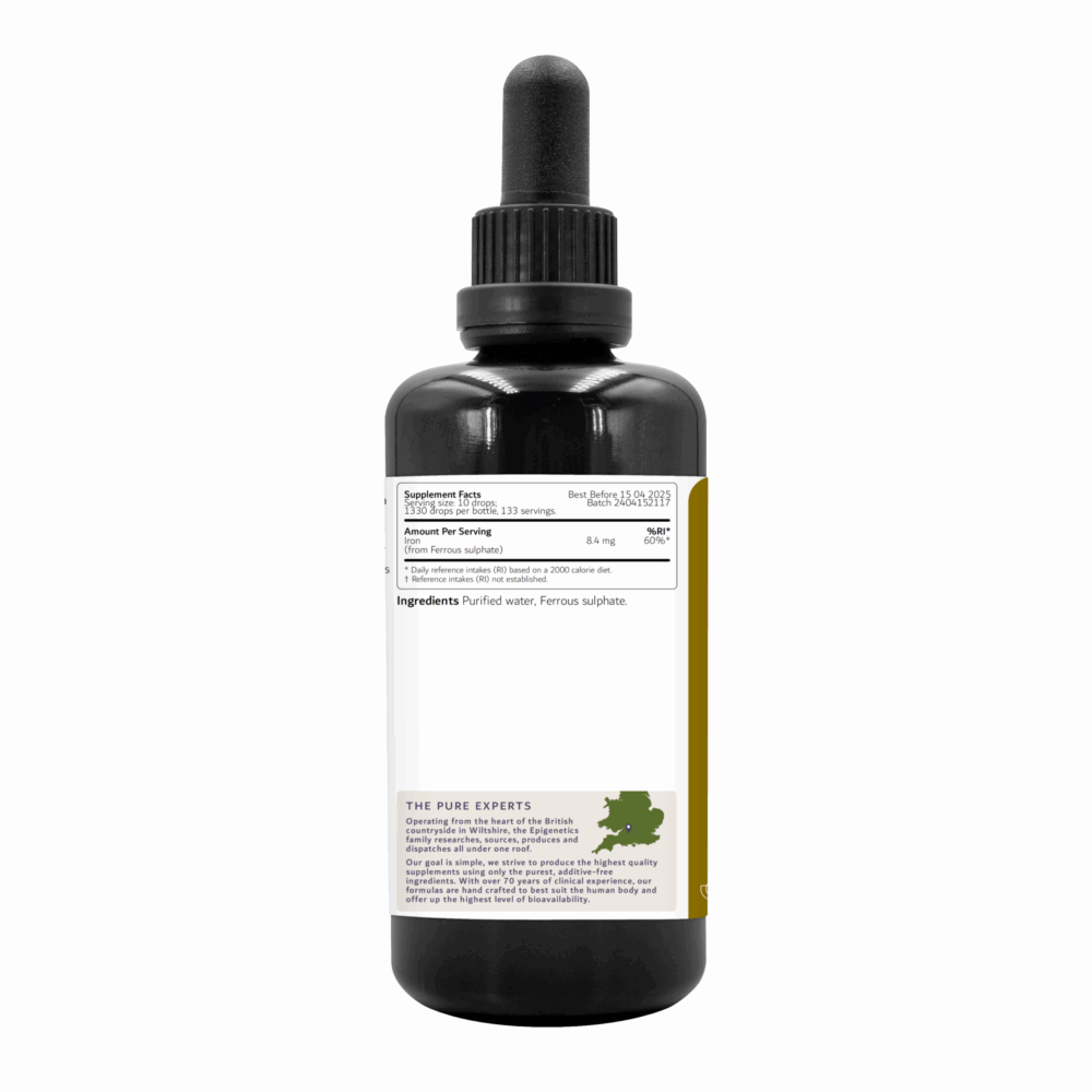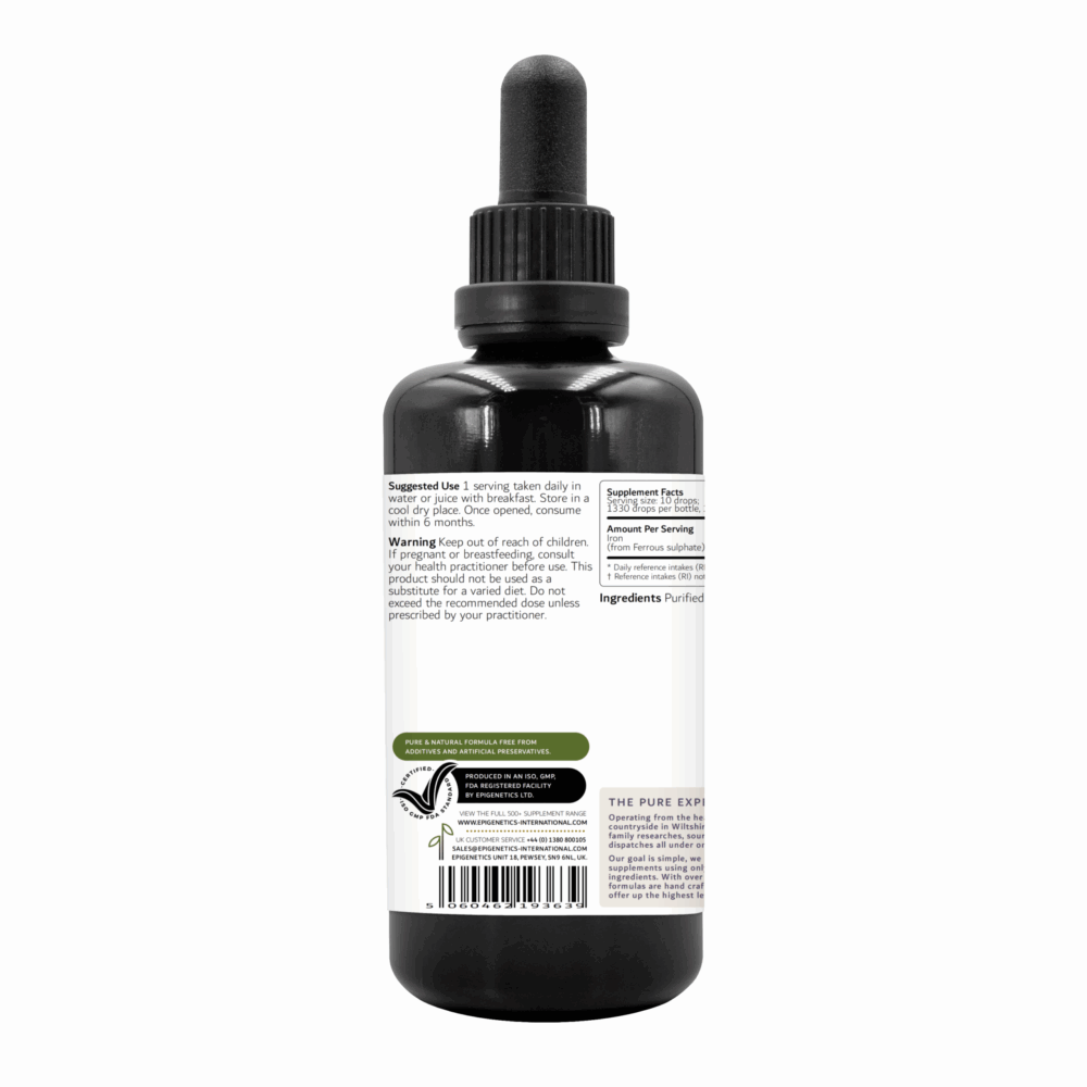 Iron sulphate is a form of iron designed to be taken as a food supplement. It may be prescribed by a doctor as a treatment for iron deficiency anaemia and to prevent iron deficiency. Iron sulphate is naturally found in red meat, beans, nuts, asparagus, oatmeal and dried peaches. Epigenetics liquid iron sulphate is a pure and controlled formulation containing only purified water and ferrous sulphate.