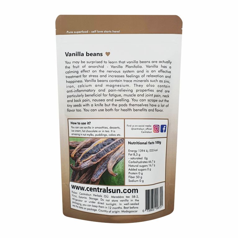 Centralsun Vanilla Beans are 100% pure. Free of additives and GMOs.