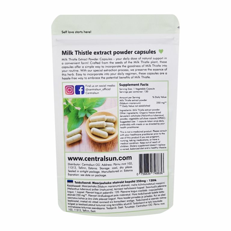 Centralsun’s milk thistle extract capsules are produced according to high-quality standards and are suitable for daily use as part of a healthy lifestyle.