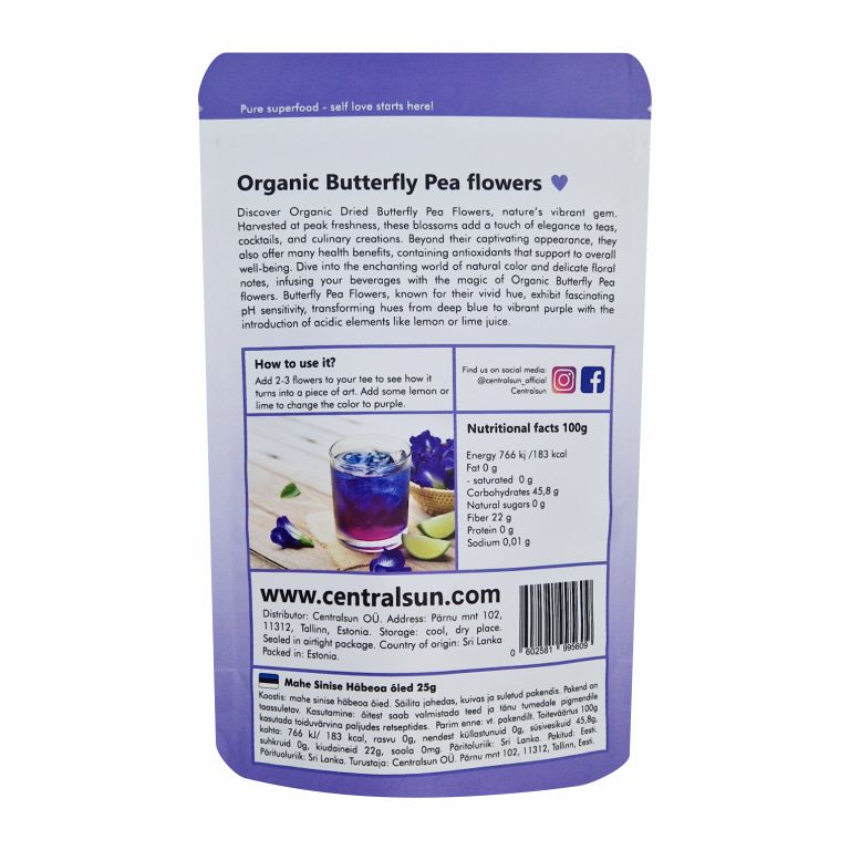 Centralsun Organic Butterfly Pea flowers are 100% pure and vegan. Free of additives, gluten, GMOs