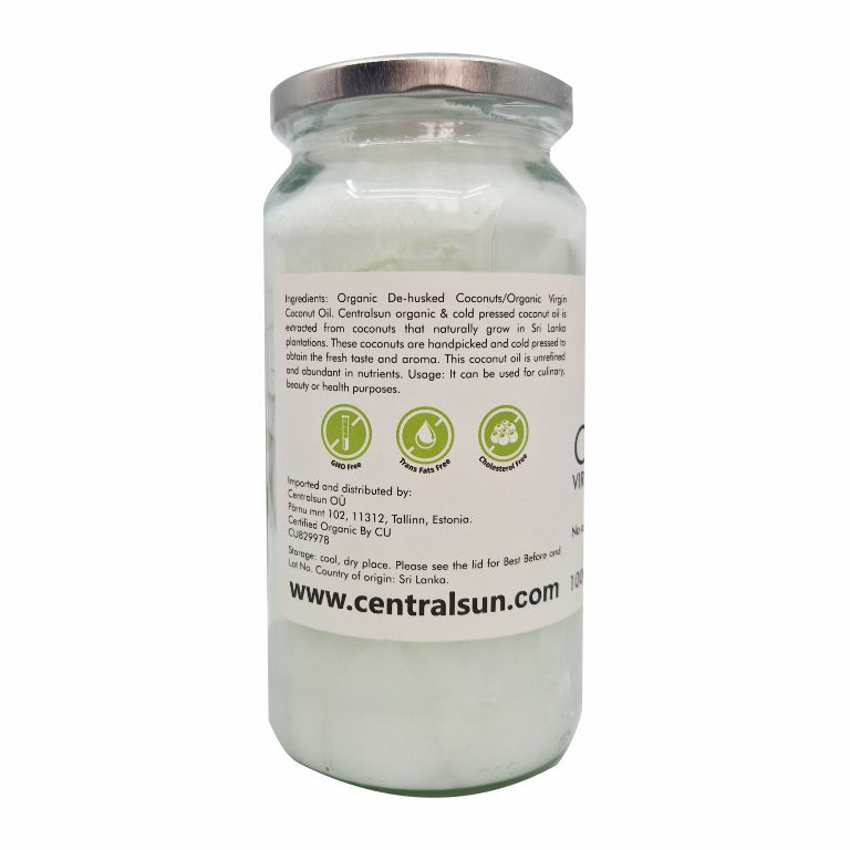 Centralsun organic and cold-pressed coconut oil is obtained from coconuts grown in plantations in Sri Lanka. Coconuts are harvested by hand by humans (not monkeys). This coconut oil is unrefined, i.e. with the characteristic taste and smell of coconut, and contains rich nutrients. Suitable for both culinary and external use. Packed in a glass jar.