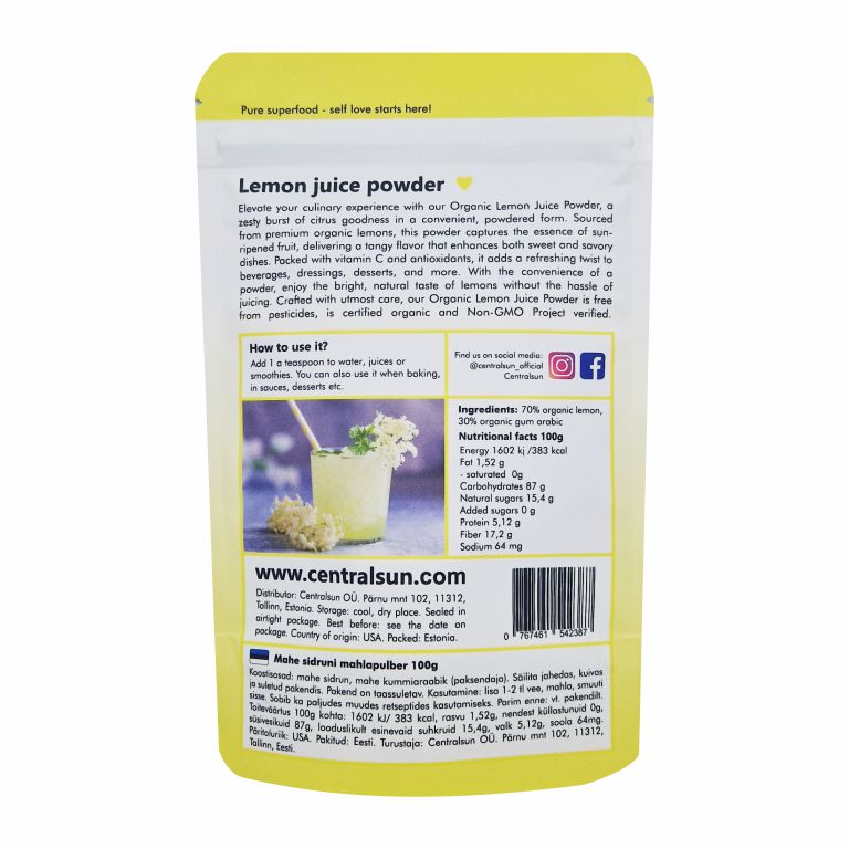 This is a 100% natural, high-quality product made from carefully selected organic lemons. The juice is cold-pressed to preserve the maximum amount of vitamins, enzymes, and bioactive compounds. It is then dried at low temperatures and finely ground into powder – resulting in an intense flavor, fresh aroma, and nutritional value packed into each spoonful.