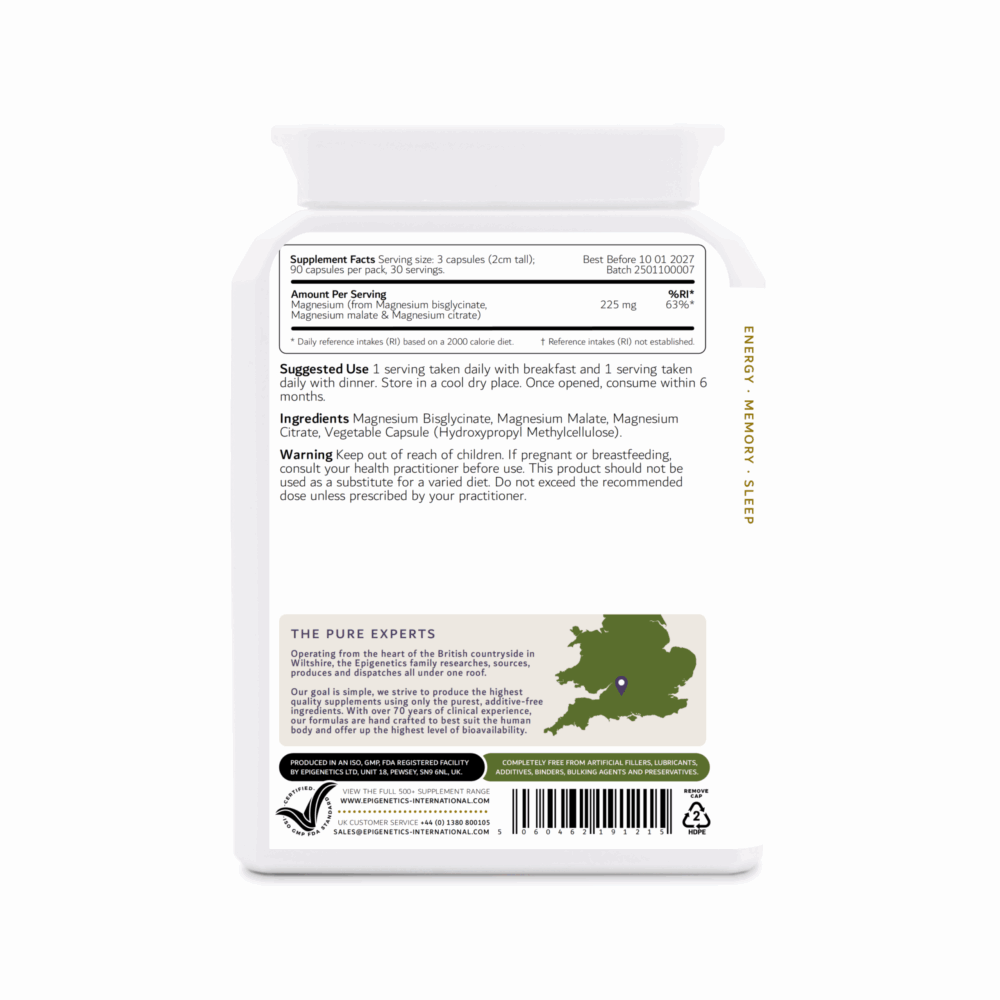 Triple Magnesium – an effective magnesium complex that combines three forms of magnesium – glycinate, malate and citrate – to optimise energy production. Epigenetics Triple Magnesium capsules are: