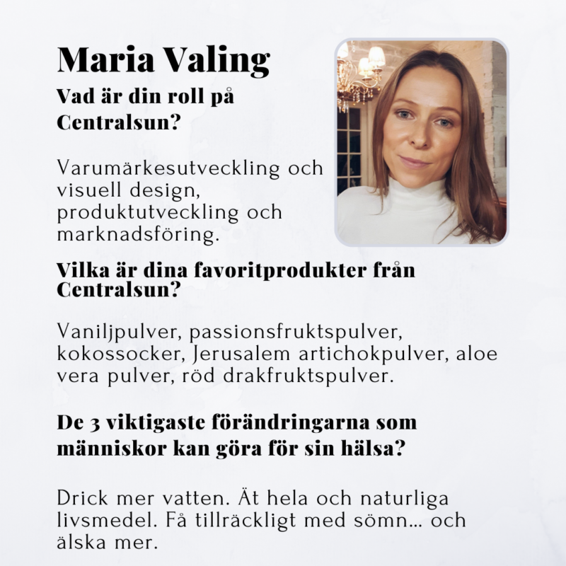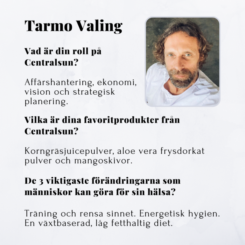 Centralsun bygger på kvalitet, integritet och passion. Vårt uppdrag är att förbättra människors livskvalitet genom god hälsa genom att göra näringsrika produkter mer tillgängliga och prisvärda för alla. Vi vill också utbilda både oss själva och våra kunder genom att transparent erbjuda de bästa superfoods och ingredienser av högsta kvalitet till ett rimligt pris.